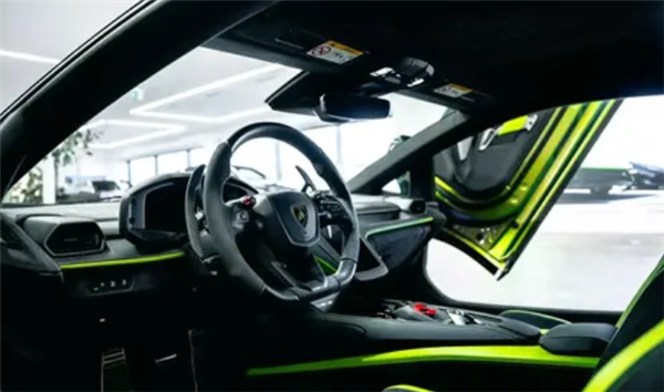 除了独特的涂装,这款Revuelto特别版在造型设计上与标准版车型保持一致,但为了与车身主色调搭配,特别版搭载了浅绿色的制动卡钳和亮黑色的多辐轮辋。